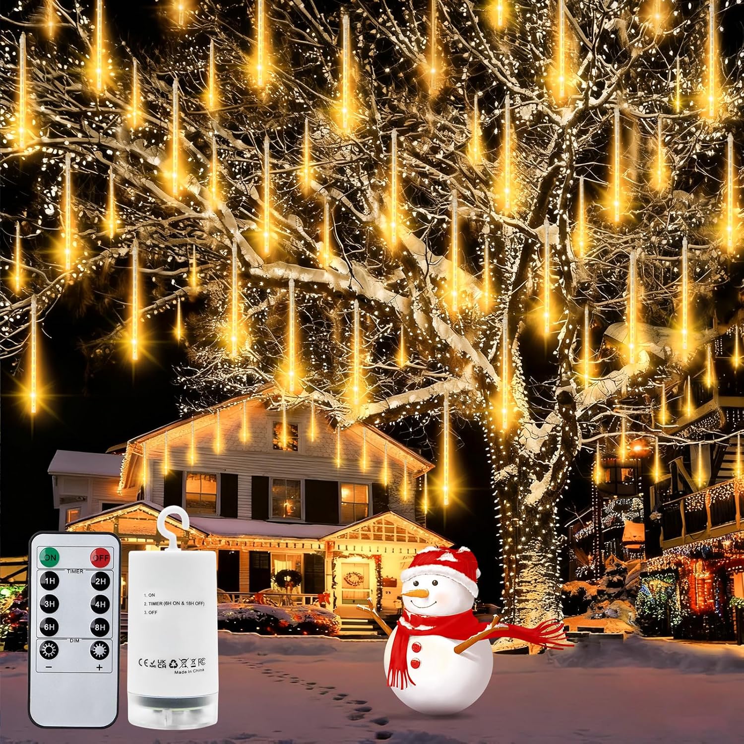 The meteor shower raindrop lights outdoor are transparent PVC tube cover design. With an IP65 waterproof rating, these raindrop lights are perfect for outdoor indoor use, whether it's rain or snow. You can safely hang it for windows, roofs, porches, patio umbrellas, Christmas, parties, weddings, and more(Note:Battery Box is not Waterproof)